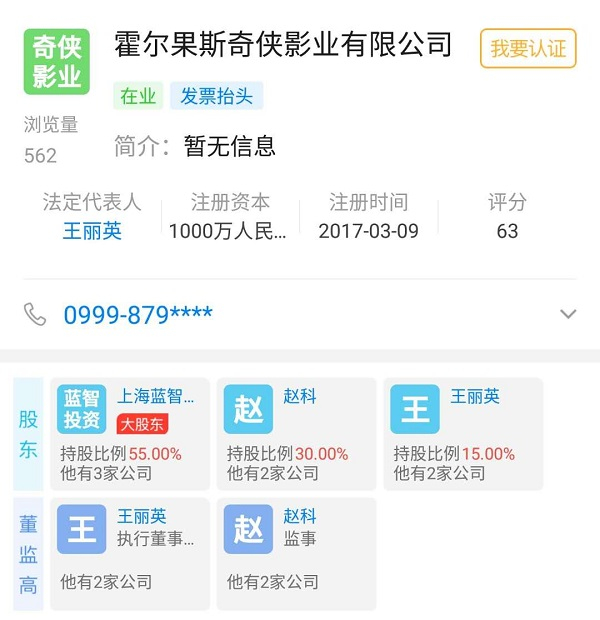 霍尔果斯奇侠影业有限公司相关信息