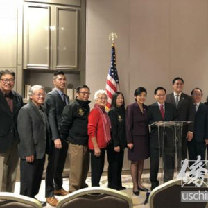 出席17日记者会的部分代表,中间为联邦众议员赵美心。(图片来源:美国侨报实习记者王珂莹摄)