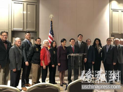 除了主持新闻发布会的前加州众议员伍国庆(Mike Eng)外,到场人士还有联邦众议员赵美心(Judy Chu)、阿罕布拉市市长马洛尼(Jeff Maloney)、蒙特利公园市市长陈赞新、和圣盖博市副市长卜君毅等人。