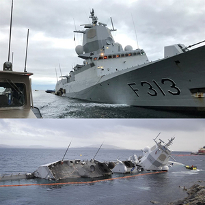 11月8日凌晨,挪威海军南森级“英斯塔”号护卫舰(排水量约5290吨)在参加完北约“三叉戟2018”多边联合军事演习之后,与一艘马耳他籍“Sola TS”号油轮(标准排水量约62000吨)相撞,遭受重创。由于难以控制进水,舰体发生部分倾斜,军舰不得不抢滩搁浅。其遭撞击后搁浅之初大概有三分之二的舰体露出水面,但由于固定军舰舰体的钢索断裂,军舰基本沉没——这说明救援并没有取得很好的效果。