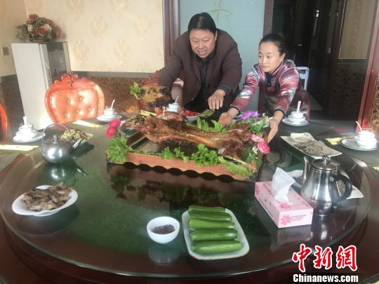 图为刘志民将烤全羊摆桌。 张帆 摄