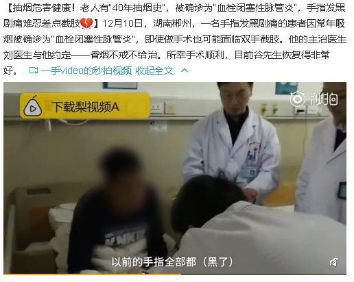 近日,湖南一名手指发黑并伴有剧痛的患者因为吸烟被确诊为“血栓闭塞性脉管炎”,即使做手术也可能面临双手截肢。医生与他约定,香烟不戒绝对不治,所幸手术顺利,目前恢复得非常好。