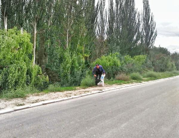 杨占吉在捡拾垃圾。 图片由贵德县农牧林业和环境保护局湿地办公室提供