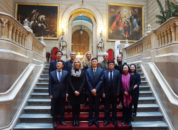 12月11日,巴塞罗那大学校长国际事务代表比比雅娜•克雷斯波(Bibiana Crespo)、国际发展服务部门代表安东尼奥•吉尔(Antonio Gil)、地理与历史学院科研副院长贾米•布谢达(Jaume Buxeda)、法学院国际事务与科研副院长马尔•坎比斯(Mar Campins)、西班牙语研究中心学术主任伊娃•马丁内斯(Eva Martínez)与代表团进行了工作会谈。比比雅娜从巴塞罗那大学历史、校园规划、国际化举措、院系与课程设置、教学创新与质量保证、科学研究、文化活动与社区服务等方面进行了全面介绍,并就双方共同感兴趣的学生长短期项目、互派教师讲学与培训、合作科研等工作进行了交流。她表示,巴塞罗那大学正积极推动与亚洲,特别是与中国高校开展更多合作,建议两校在相关学科达成共识的基础上签署合作备忘录,进一步推进两校在上述领域的实质性合作。