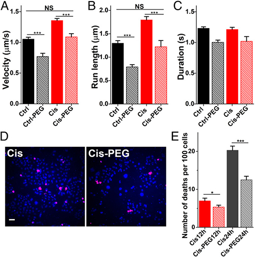 图4. 通过调节渗透压将凋亡细胞内的转运动力学降低至正常水平(A-C),发现减缓了细胞的凋亡进程,顺铂药物作用12和24小时后的死亡细胞比例显著下降(D-E)。
