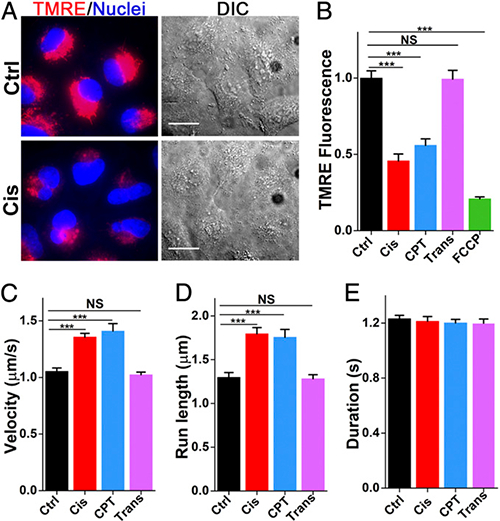 图2. TMRE荧光染色方法识别早期凋亡细胞(A-B),发现早期凋亡细胞内部的定向运动显著提高(C-E)。