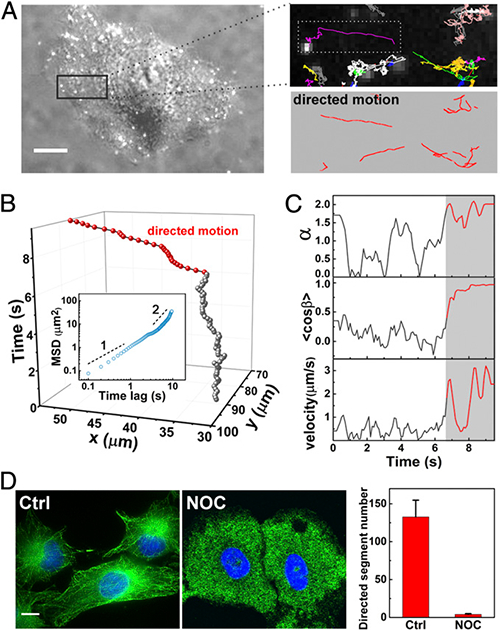 图1. 细胞内的单分子荧光跟踪及运动轨迹的动力学分析。
