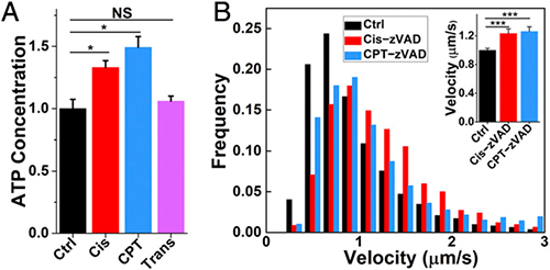图3. 早期凋亡细胞内的ATP浓度升高(A),并且发生于Caspase信号通路上游(B)。