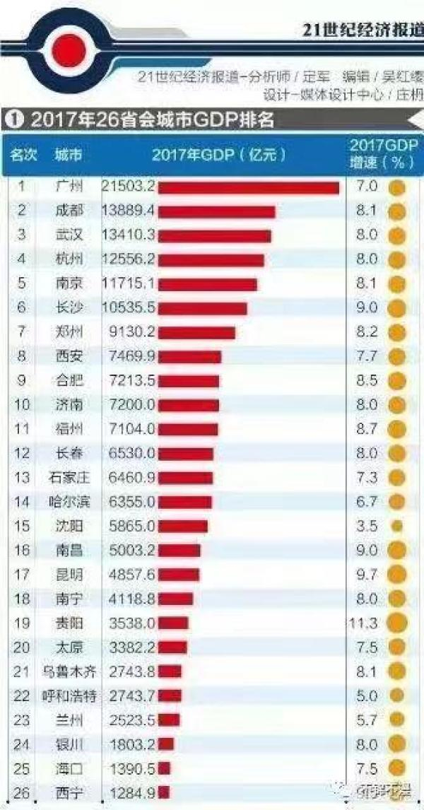 省会是一个省的行政中心,一般都是该省的政治、经济、科教、文化和交通中心,所以作为一省之都会,其发展基本上也是全省经济最好的几个城市之一。有的省会GDP在它的省份里是最高的,甚至还出现“一城独大”的局面。2017年全国各省份的省会GDP如下,目前我国GDP超过万亿人民币的只有14个城市,除去四大直辖市之外,就有6个万亿GDP城市是省会城市。