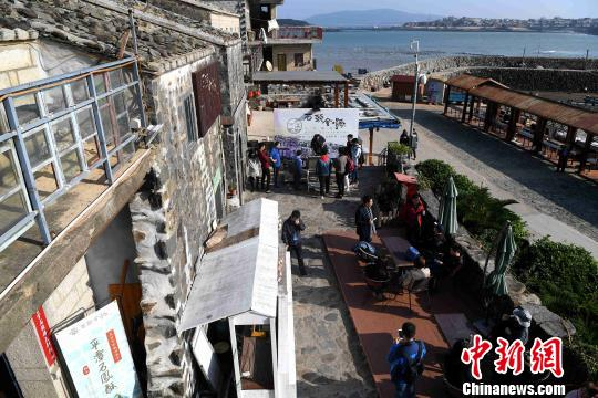 图为游客在平潭北港村“石头会唱歌”艺术聚落参观。2016年3月,来自台湾的“石头会唱歌”团队来到北港,向村民租下了8栋石头屋,开发成集民宿、文创、料理等为一体的“石头会唱歌”艺术聚落,把台湾元素与平潭石头屋完美融合在一起。 张斌 摄