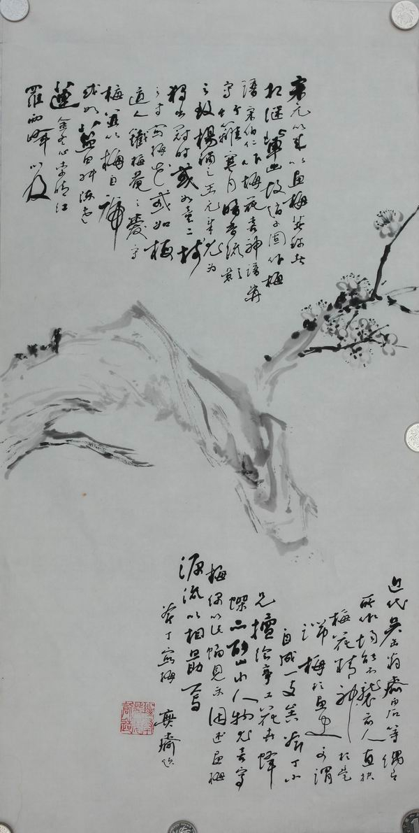 “宋元以来,以画梅著称者相继辈出。故赵子固作梅谱,宋伯仁作梅花喜神谱。备写竹篱寒月、暗香疏影之致。杨补之、王元章尤为独出冠时。或如梅道人、铁梅庵之爱写梅,并以梅自号。或如蓝田叔、陈老莲、金冬心、李晴江、罗两峰以及近代吴缶翁、齐白石等偶有所作,均能不袭前人,直抉梅花精神于毫端。梅于画史可谓自成一支矣。斧丁小兄擅绘事,工花卉蜂蝶,亦能山水、人物,尤喜写梅,偶以此幅见示,因述画梅源流以相勗焉。斧丁写梅。无斋题。”