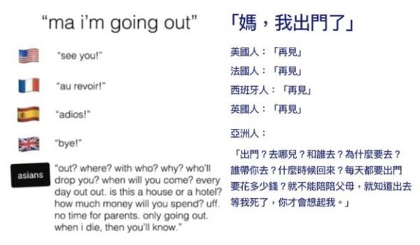 幽默的一个常见来源是“亚洲父母”——他们通常被描绘成谨慎、严厉和专横的形象。