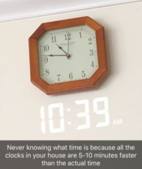 “你永远不知道现在几点了。因为你家里的所有时钟都比真实时间快5到10分钟。”