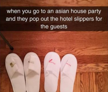 “当你参加一个亚洲家庭聚会,他们为客人摆上酒店的拖鞋。”