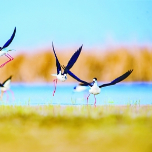 在北京野鸭湖求偶打斗的候鸟黑翅长脚鹬 徐永春摄/光明图片