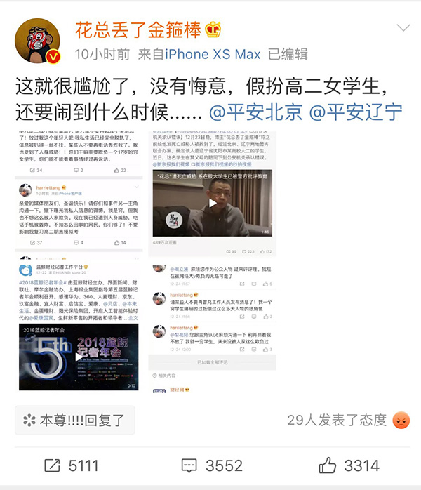 对此,花总微博称“这就很尴尬了,没有悔意,假扮高二女学生,还要闹到什么时候”。有网友评论称,陈某“态度十分嚣张”、“需加强普法教育”。