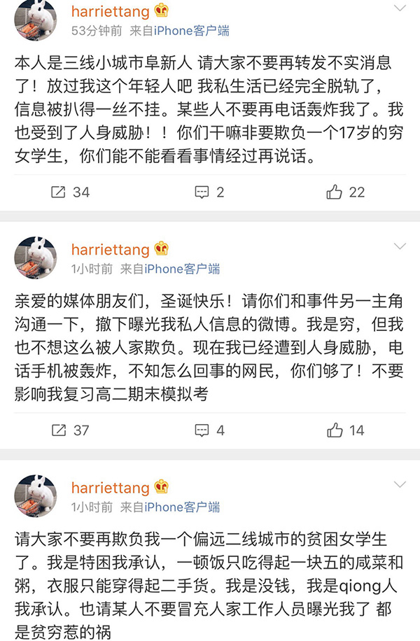 12月24日午间,陈某连发数条微博改变态度,自称自己是“17岁的穷女学生”、“这件事情是个大乌龙”、“已遭到人身威胁,不要影响我复习高二期末模拟考”,还@周立波“过来评评理”,自称“被网络大V欺负得无路可走”。
