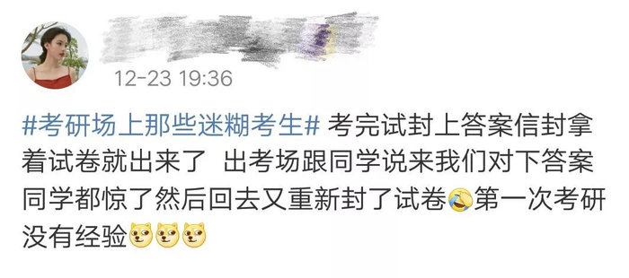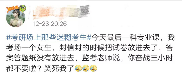 考研结束后,一条名为#考研场上那些迷糊考生# 的热搜彻底刷新了我的认识。到底在考场上都发生过哪些意想不到的事情?