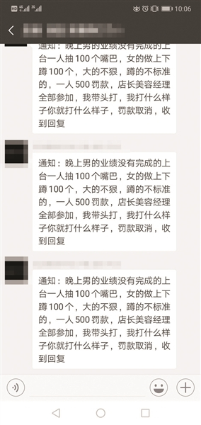 此外,还有就是花样繁多的“体罚”,包括10公里跑,吃辣椒、洋葱,喝整杯的醋,等等,并将惩罚的视频在工作群内发布。“每天晨会要下达当天的业绩指标,到了晚上没有客人基本可以歇业时,开总结会,对照业绩,一个个地接受惩罚。”而惩罚的内容,由于种类繁多,老板通常在上午晨会时就会公布,提醒员工们当晚的“体罚”内容具体是什么。
