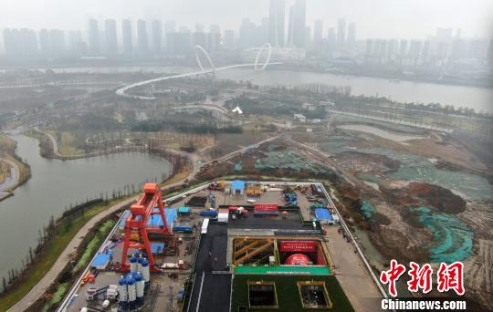26日,由中铁十四局集团承建的南京长江第五大桥A3标夹江隧道工程始发掘进,这标志着开挖直径达15.46米的国内大直径公路盾构隧道进入主体施工阶段。当天的盾构机被披上了象征顺利开掘的红色“外衣”,从航拍上看,它像被装在江边的“匣子”中,掘进方向对准了长江对岸。 泱波 摄