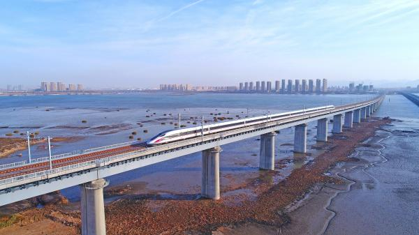 12月26日,济青首趟高铁列车快速驶过中铁十四局承建的跨胶州湾特大桥。 视觉中国 图