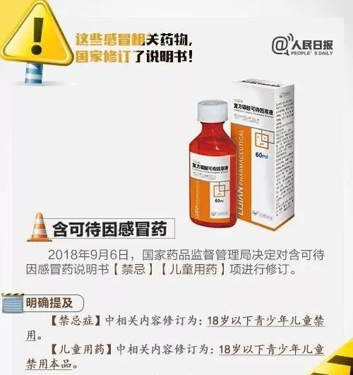 国家药监局9月6日发布通知,对含可待因感冒药药品说明书进行修订。在[禁忌症]一栏中,相关内容修订为“18岁以下青少年儿童禁用”;在[儿童用药]一栏中,相关内容修订为“18岁以下青少年儿童禁用本品”。