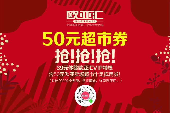 迎新年!欧亚汇送豪礼!39元抢购50元欧亚卖场超市专享券