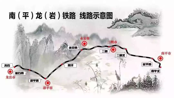 南平至龙岩铁路北起福建省南平市,南抵龙岩市,线路全长248.1公里,设计时速200公里,是一条以客运为主、兼顾货运的快速铁路通道,设有南平北、延平西、三明北、三明、永安南、双洋、漳平西、雁石南、龙岩9座车站。