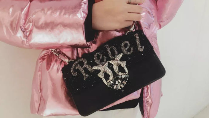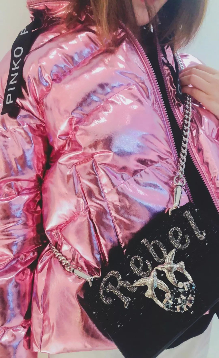 今年最流行的粉色亮面羽绒搭配PINKO经典的燕子包,这个组合绝对是冬季灰色街头的一抹粉色闪电!