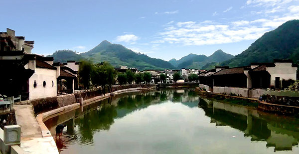 太极湖村的村口,俨然是一副流动的青山水墨画。