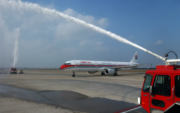 图说:2008年12月15日,两岸直航平日包机正式启动,台北桃园机场以“水门”方式为首航包机接风洗尘。