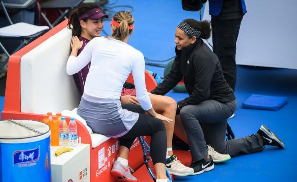 她在回球时突然腿部抽筋,申请了医疗暂停,但小姑娘并没有放弃,大腿缠着绑带坚强地重返赛场。之后,她又在接莎娃一个落点很深的回球时痛苦倒地,甚至一度躺在地上无法起身。