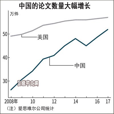 《中国的论文数在10年间迅速增加》;