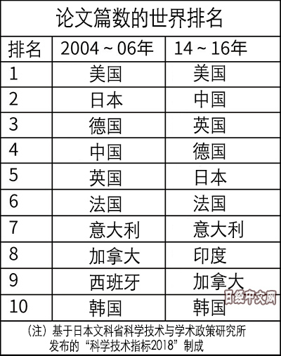 日本文部科学省发布的“科学技术指标2018”显示,从2014年至2016年各国发表的论文篇数占整体的比例来看,美国为25.1%,中国为19.9%。均大幅超过居第3位的英国(7.1%)和第5位的日本(5.5%)。