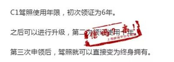 网帖称,C1驾照使用年限初次领证为六年,之后可以进行升级,第二次领证使用十年。第三次申领后,驾照就可以直接变为终身拥有。