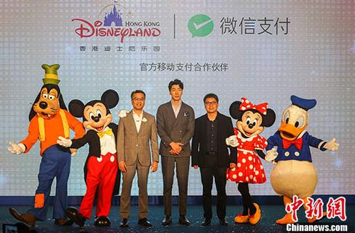 图为米奇、米妮、唐老鸭等迪士尼卡通人物,与微信支付合作方人员合照。 中新社记者 张炜 摄