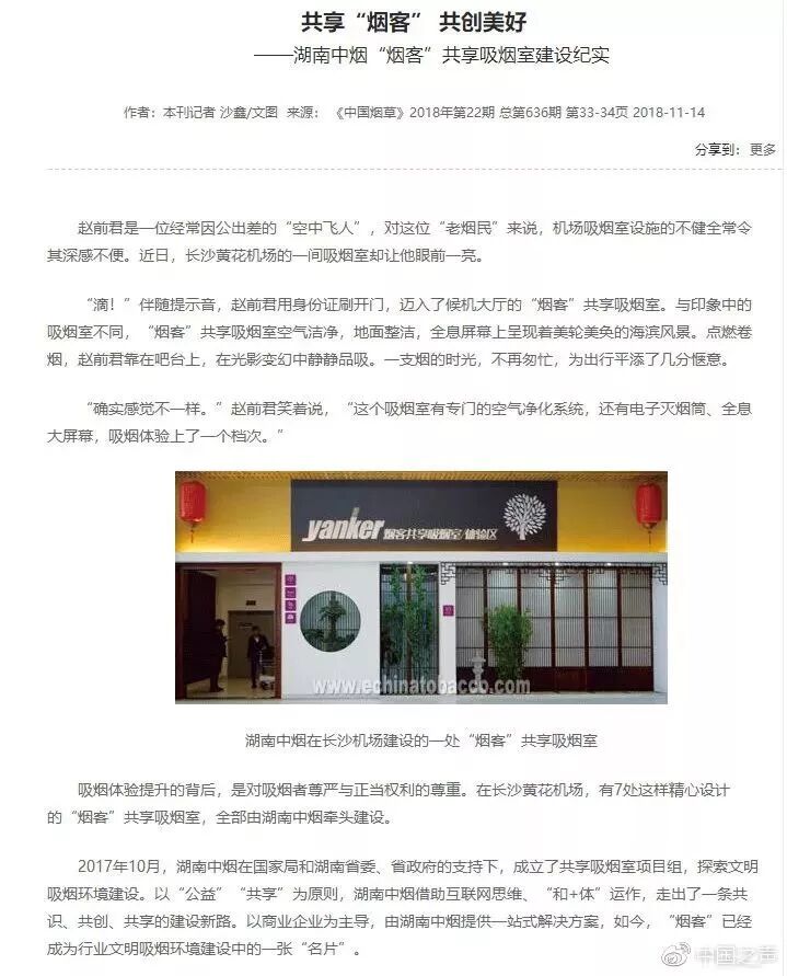 《新闻纵横》编辑进一步查询发现,这个项目的背后,其实是一家烟草企业。在国家烟草专卖局主管的《中国烟草》杂志2018年第22期上,有一篇名为《共享“烟客”共创美好——湖南中烟“烟客”共享吸烟室建设纪实》的报道,证实项目由烟草企业湖南中烟建立,通过与其他企业合作,建设文明吸烟环境。文章中有这样的表述,其建立的吸烟室有的引入了智能门禁系统、智能点烟器、智能灭烟筒等新技术、新设备,“令吸烟者抽吸体验不再枯燥……未来,将进一步优化吸烟体验,让吸烟者更有尊严,更好地为建设美丽中国的战略服务。”