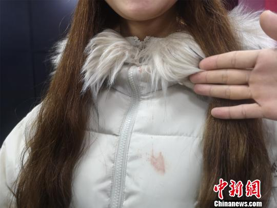 林敏的同学谢某在阻拦轻生者时嘴巴磕破流血,衣服上留着血迹。 朱柳融 摄