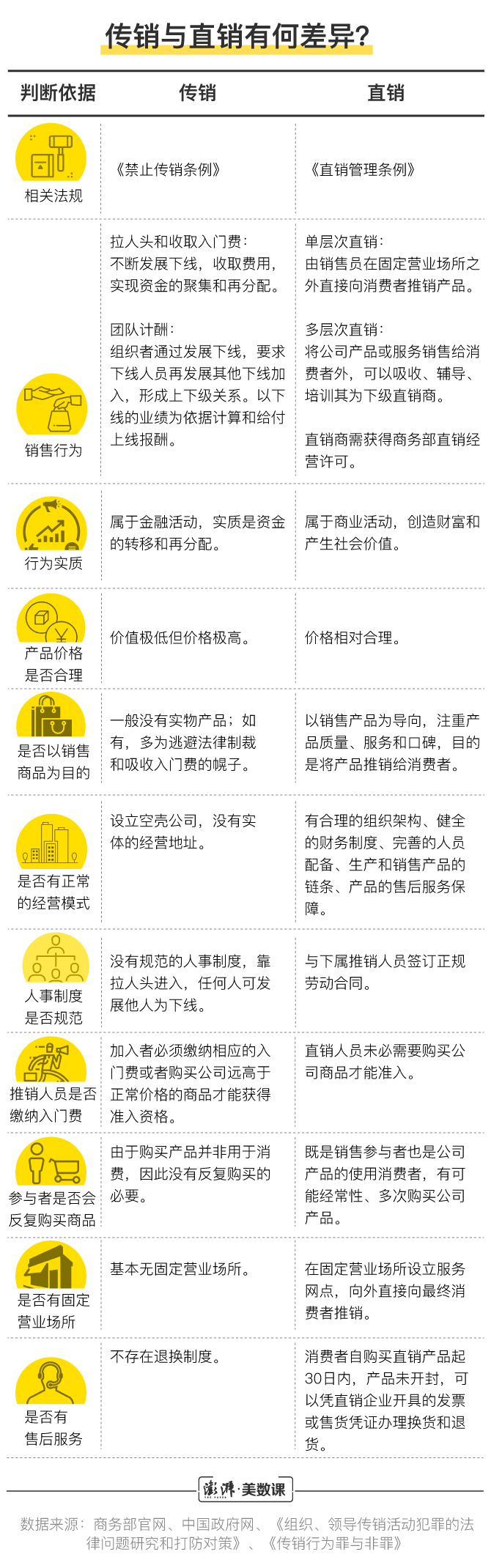 在相关法规的明文规定中,传销和直销的差异界定包含销售行为、产品与价格、销售目的、人事制度和售后等多个方面。