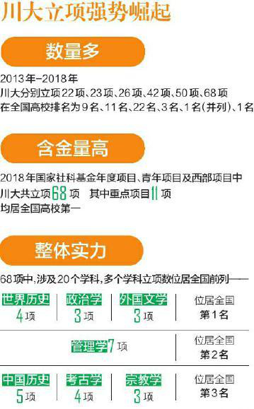 文科是川大的底色和亮色,是学校的传统优势学科,有基础、有实力、有地位、有特色。近年来,学校文科建设取得了可喜成绩,特别是2018年我校国家社科基金立项创造了历史最好成绩,同时在人才人物工程、资政服务、高水平成果及获奖等方面均取得显著进展,学校人文社科竞争力位居全国前列,影响力与日俱增。