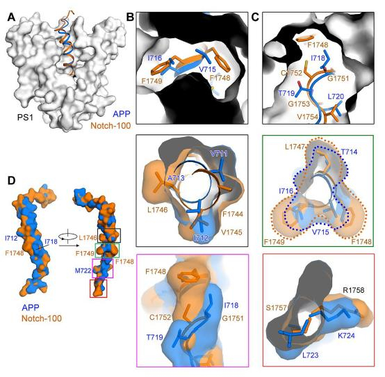 研究团队通过系统性地在结构当中比较Notch与β淀粉样前体蛋白APP部分被加工区域的区别,揭示了研发这种特异性抑制剂的潜在的结合位点。有很多与阿尔兹海默症相关的突变集中在PS1和APP上,这些突变可能会导致对APP的异常切割。其中一些会发生多种突变的位点,大多就集中在γ-分泌酶识别APP的位置。研究团队通过对结构的详细分析,分类讨论了这些突变可能影响底物结合的机理。