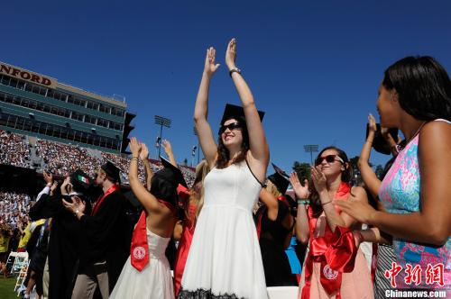 资料图片:美国加州的斯坦福大学举行毕业典礼。图为斯坦福大学学生起舞庆毕业。中新社发 陈钢摄