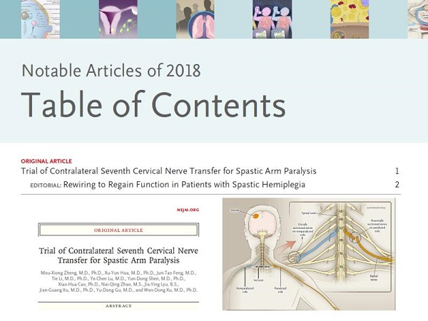 这一研究为中国原创、世界首次应用于中枢瘫患者的治疗中,凝聚了华山医院手外科团队数十年的心血,是几代人坚持不懈、努力创新的成果。相关创新手术策略应用于临床,取得了良好的恢复效果,研究结果2018年1月4日于国际权威期刊《新英格兰医学杂志》发表。今天,该杂志官网公布了12篇2018最受瞩目文章,徐文东教授、顾玉东院士团队的研究成果榜上有名,这也是中国大陆首次获此殊荣。据悉,这项技术已经通过举办国际学习班、开展多中心研究、专病联盟的设立、招收外籍进修学员等方式,在全球范围内推广,造福世界各地的患者。