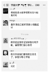 昨天下午,学校学工办老师回应北京青年报记者称,学校并非“从小学、幼儿园获得灵感”,而是在日常工作中发现有学生在宿舍打游戏、翘课等情况,“学生教育需要学校、社会和家长三方面共同努力,所以有了这样的想法。”老师解释,目前学院的27个班级均已建立家校群,“在群里,我们也不会给家长打学生的‘小报告’,即使通知奖惩情况也不会‘点名道姓’,主要想和家长之间多一点联系。”