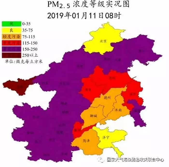 1月11日,“2+26”城市中有4个城市达到轻度污染、2个城市达到中度污染、19个城市达到重度污染、3个城市(太原、石家庄和保定)达到严重污染。日均PM2.5浓度最高值出现在太原市,为298微克/立方米。
