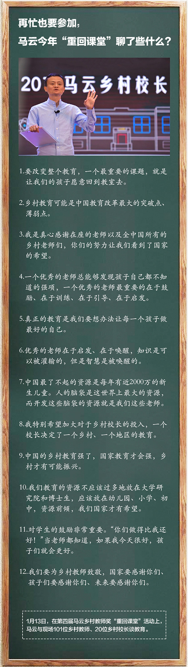 毛主席说我们要农村包围城市,要从乡村开始改变,因为你们这儿,我希望马云乡村教师的想法,整个教育工作,就是让孩子做最好的自己。有些孩子读书是有天赋的,我有时候在班里面,我那时候读书,有些孩子读书就是好,像上辈子会读一样。我背了五遍、十遍都不行,他过目不忘。像我们公司有几个年轻人,我真觉得有时候很嫉妒,这些人是过目而不忘,耳朵听见,他都能背出来,你读书是读不过他的,但是没办法,老板还是我。
