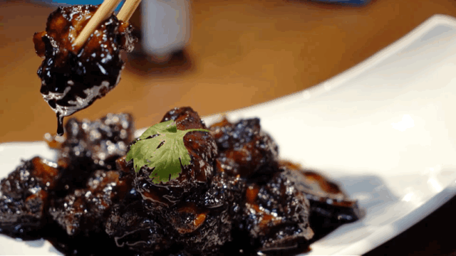 是用新鲜排骨加了黑蒜汁烀出来的,
