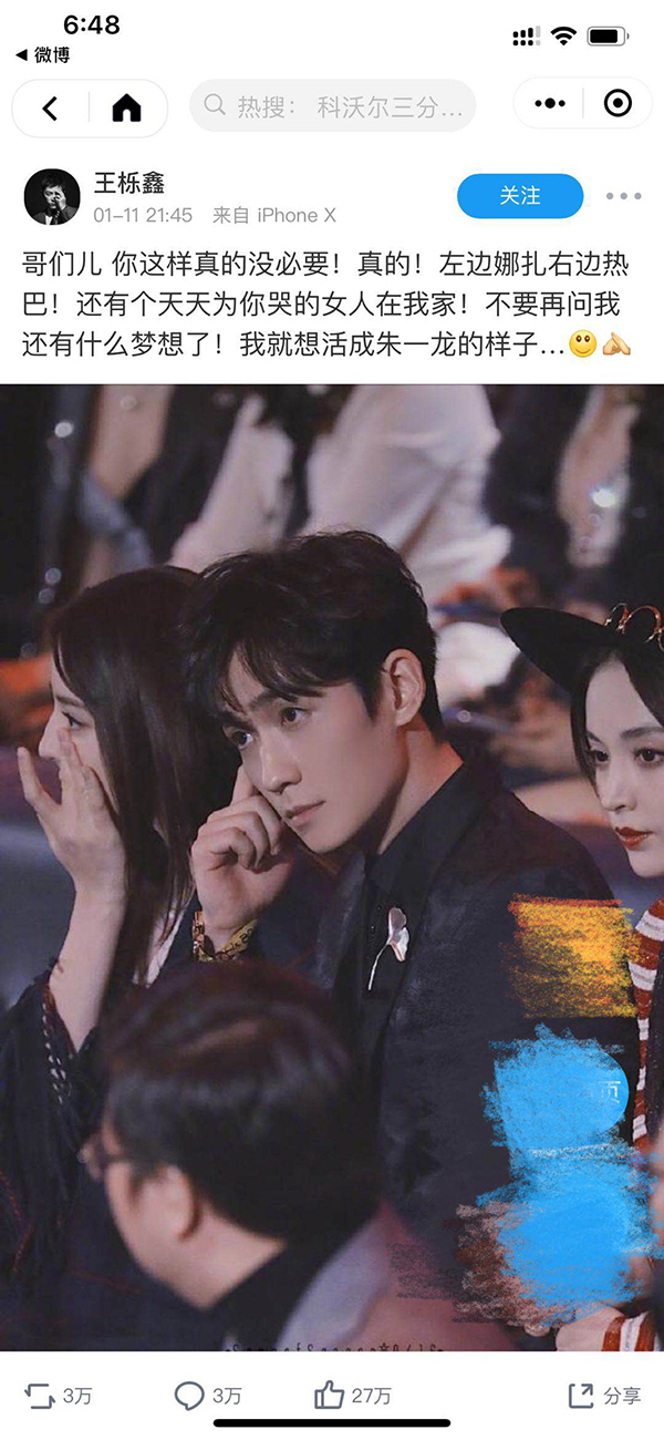 上周,《知否知否,应是绿肥红瘦》持续热播,并持续提供话题。谁曾想当年一档街访节目中的过客——市民朱先生,如今成了无数少女的心头好,剧中,朱一龙饰演的小公爷与赵丽颖饰演的明兰有缘无份,最近播放的两集中,小公爷迫于邕王势力与嘉成县主政治联姻,无颜面对明兰,托顾廷烨将定情信物——泥塑男娃娃送还,站这对cp的吃瓜群众们要哭瞎眼,连歌手王栎鑫都在微博吐槽:哥们儿 你这样真的没必要!真的!左边娜扎右边热巴!还有个天天为你哭的女人在我家!