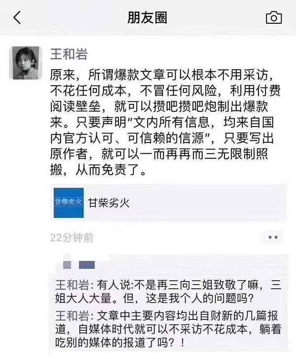 刚发出来,文章中多次提到的“三姐”——财新网资深记者王和岩就发朋友圈抨击呦呦鹿鸣“所谓爆款文章可以根本不用采访,攒吧攒吧炮制爆款来”。接着呦呦鹿鸣又发表《社会在崩塌——关于财新网记者攻击呦呦鹿鸣一事的说明》指出,所有信息都有信源并列明出处,且“本文是一种独家叙事,讲述的并非新闻……这是呦呦鹿鸣的独家发现”。