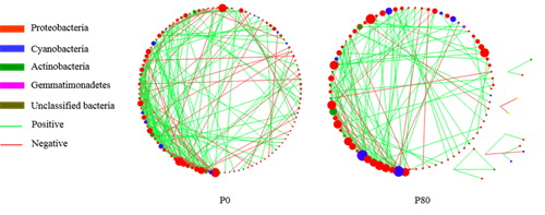 图2 缺磷(P0)和施磷(P80)处理中,碱性磷酸酶编码基因(phoD)编码微生物的生态网络图